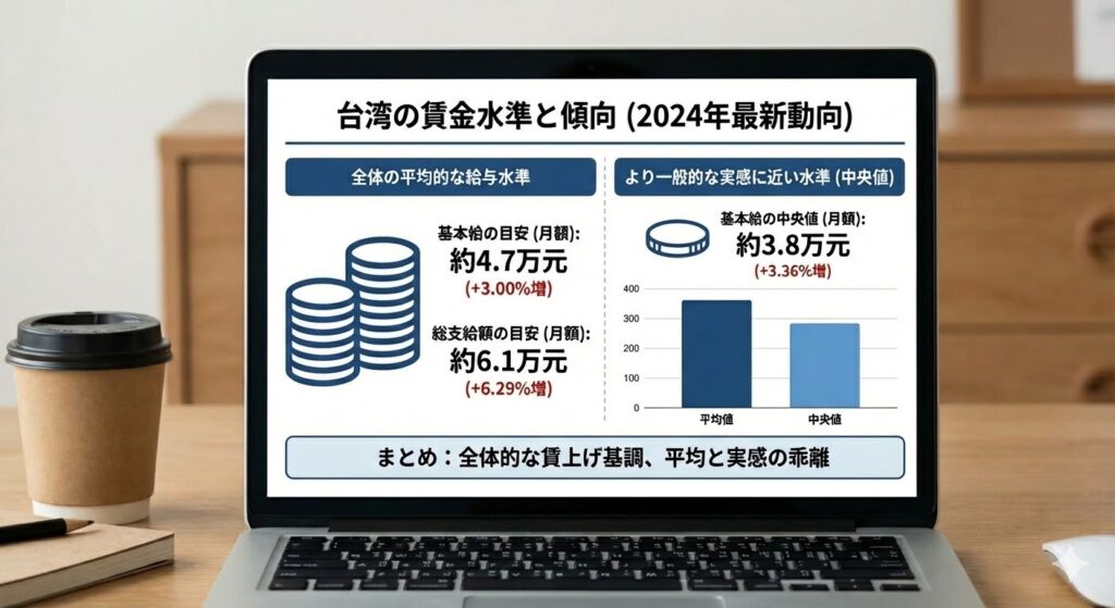 台湾全体の平均年収は2024年時点で69万台湾ドル(約364万円)程度とされており、日本の平均年収約460万円と比較すると約100万円の差があります。