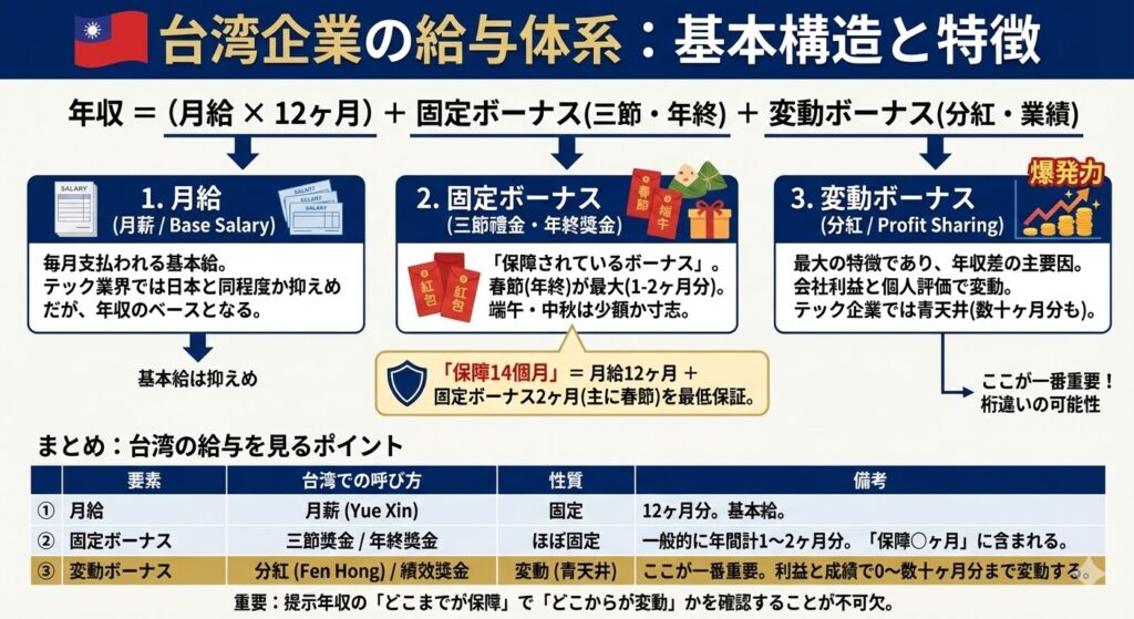 台湾独自の給与形態として13ヶ月給与(または14ヶ月給与)という制度があり、基本給の1ヶ月分相当が年末にボーナスとして支給されます。この13ヶ月給与は法律で義務付けられており業績に関係なく全従業員に支給されるため、日本の賞与とは性質が異なります。