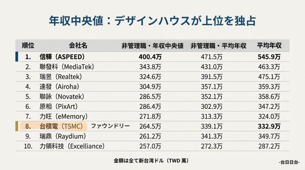 2024年のデータでは信驊科技が非管理職従業員の給与中央値でトップとなり400.4万台湾元(約1,992万円)