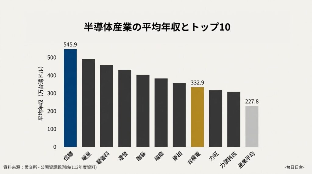 台湾の上場半導体業界における平均年収は227.8万台湾元(日本円約1,129万円)で、全産業平均の69万台湾元を大きく上回る水準となっています。